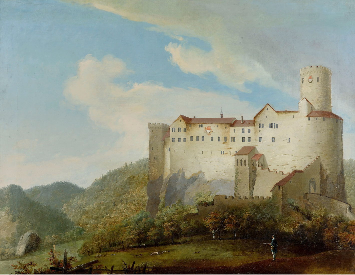Early faithful depictions are less awe-inspiring. This is Caspar Wolf’s view of the castle of Schloss Neu Bechburg at Ă–nsingen (1778), which was built in the foothills of the Jura massif in central northern Switzerland, in about 1250.