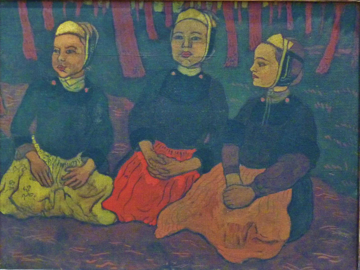 Lacombe’s Three Breton Women in the Forest from 1894 further identifies the women as being Bigoudènes, who wear their distinctive headdress in the Bigouden country in Brittany. For this painting he returned to the ancient medium of egg tempera, which enjoyed a revival among the Nabis.