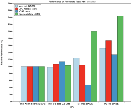 Comparison between 2 Intel and 2 Apple silicon Macs running vector and matrix functions from Apple’s Accelerate library. Was that new M3 worth the money?