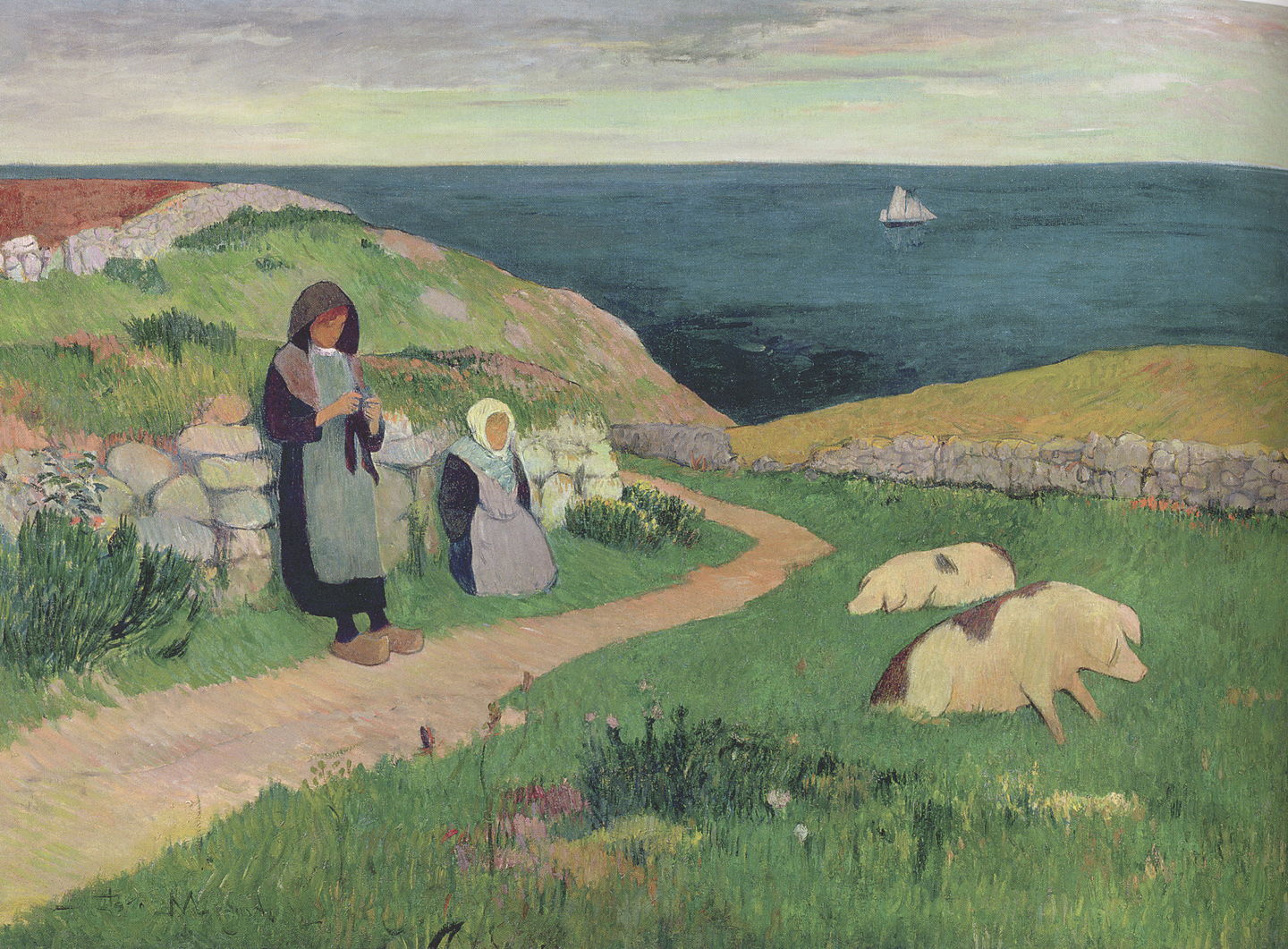 Henry Moret trained to paint in Salon style, and seems to have done so until he moved to Pont-Aven in 1888. When there, he’s thought to have associated with Gauguin, Bernard, Laval, Sérusier, and others, and later moved to the coast at Le Pouldu. From there, he spent the rest of his career painting the coast and countryside of Brittany.