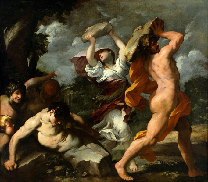 Giovanni Maria Bottalla’s Deucalion and Pyrrha (c 1635) is a well-composed narrative painting which clearly details Ovid’s version of the myth. Pyrrha and Deucalion, who has overdone Themis’ injunction to ungird his robes, stride forward, dropping hefty rocks over their shoulder. At the left, humans are seen to be emerging from those rocks by a process of metamorphosis, much as a sculptor might form their figures from marble blocks.