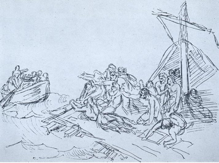 He sketched various moments during the disaster, gradually honing in on the moment of rescue. This drawing shows one of the ship’s boats from the Argus reaching the raft, for example, and Géricault drew each event from the mutiny through to the raft being left empty once everyone had been rescued. Note that in this sketch, the raft is shown as a long rectangle rather than a square.
