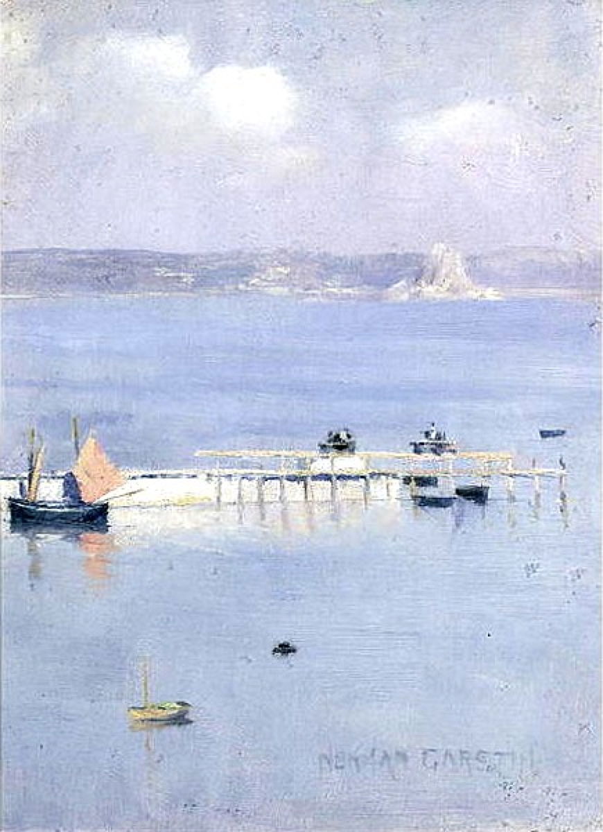 Norman Garstin was born in Ireland, trained in Antwerp and Paris (under Carolus-Duran), and joined the Newlyn School in 1886. His View Of Mount’s Bay (1892) was almost certainly painted en plein air, and shows the bay in which St Michael’s Mount is situated, although that’s far in the distance. This is the largest bay in Cornwall, stretching from the Lizard at the east to Gwennap Head at the west, south of Land’s End. This view looks east from the western side of the bay.