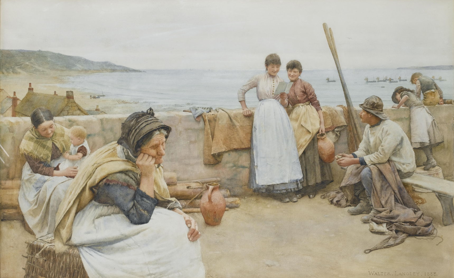Among the first, and usually credited as the founder, of the Newlyn School was Walter Langley, who set a common theme of the fishing community, much in the same way that Winslow Homer had done at Cullercoats a few years earlier. Langley’s watercolour A Village Idyll from 1888 gives a good idea of the type of motif that became popular.