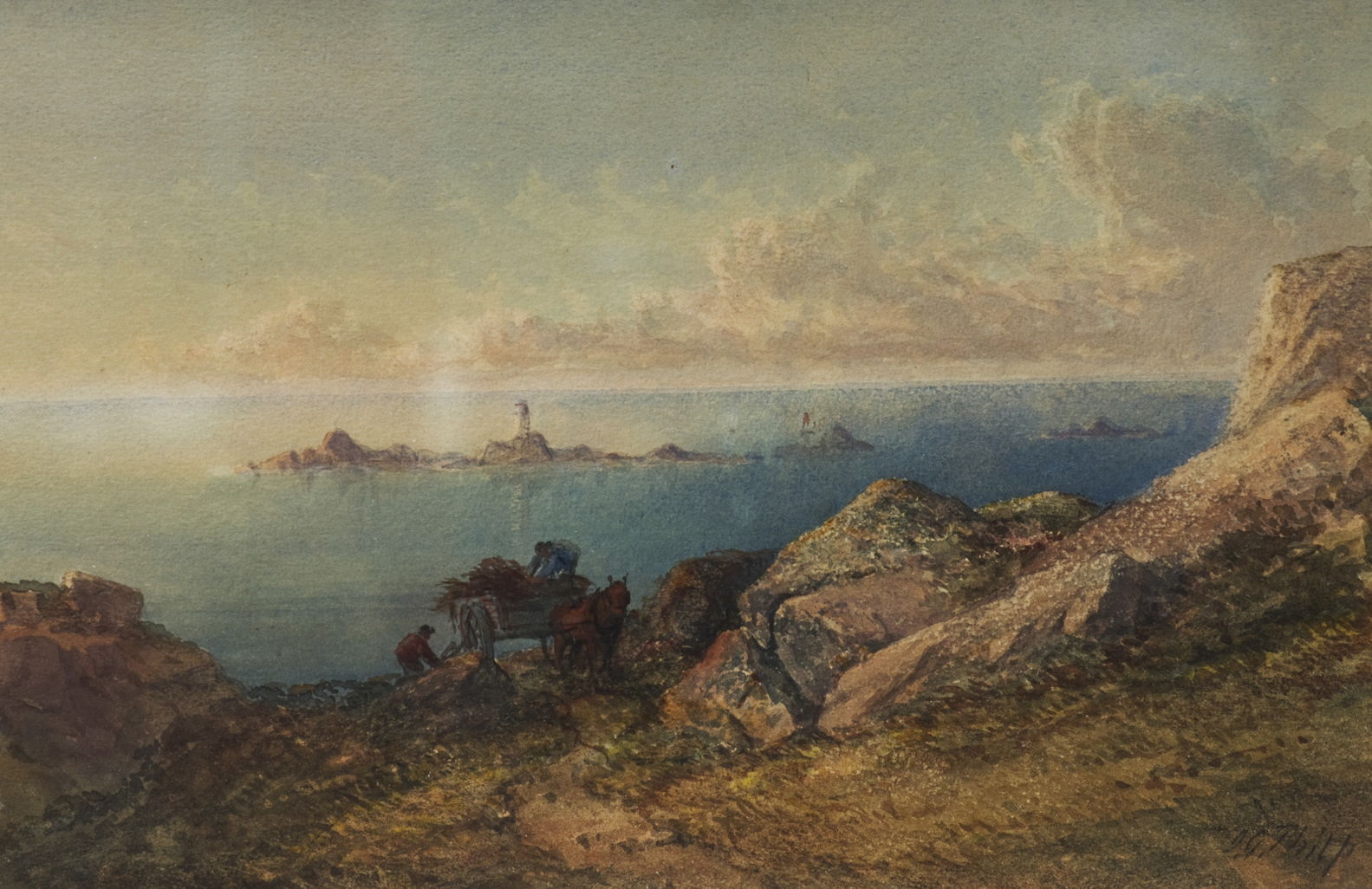 James George Philp’s watercolour of Kelp Gatherers shows a pony-cart being loaded with seaweed on the coast of Cornwall, on a fine and calm day, probably between 1850-80. Philp was a local artist whose watercolours helped awaken interest in the coast of Devon and Cornwall, when he exhibited those paintings in London.