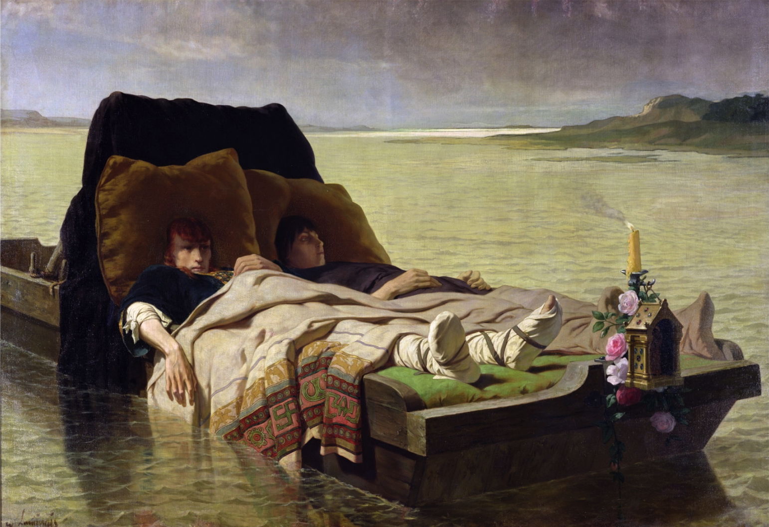 Évariste Vital Luminais painted this legendary scene of the two boys floating in their bed-like raft on the Seine, in The Sons of Clovis II (1880).