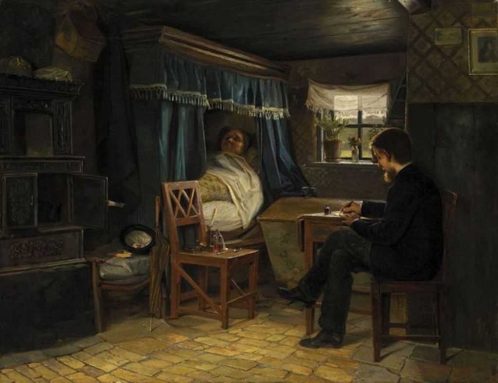 Emmery Rondahl’s The Doctor’s Orders (1882) shows a country doctor writing a prescription, perhaps, for an older patient tucked up in a magnificent fitted bed in their own home. On the chair between them, in the centre of the painting, is a candle in a holder, a bottle of medicine, and a spoon.