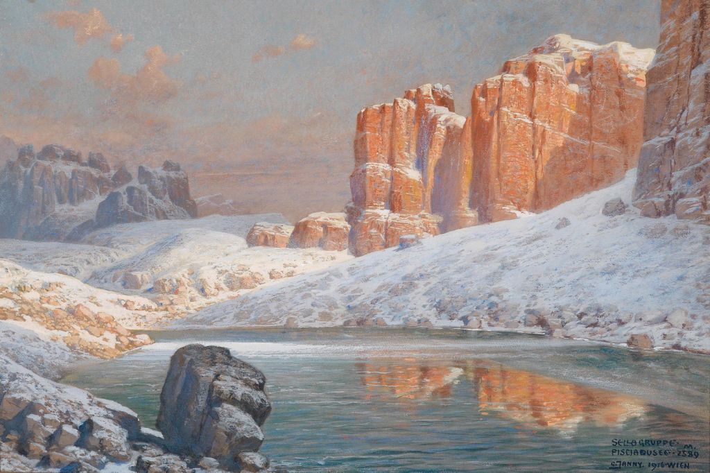 Janny also crossed the Alps to paint views of the Dolomites, including this watercolour of The Sella Group and Lake Pisciadu which he made in 1916, half way through the First World War. The Sella Group is a plateau-like massif with Piz Boè at 3,151 metres (10,338 feet).