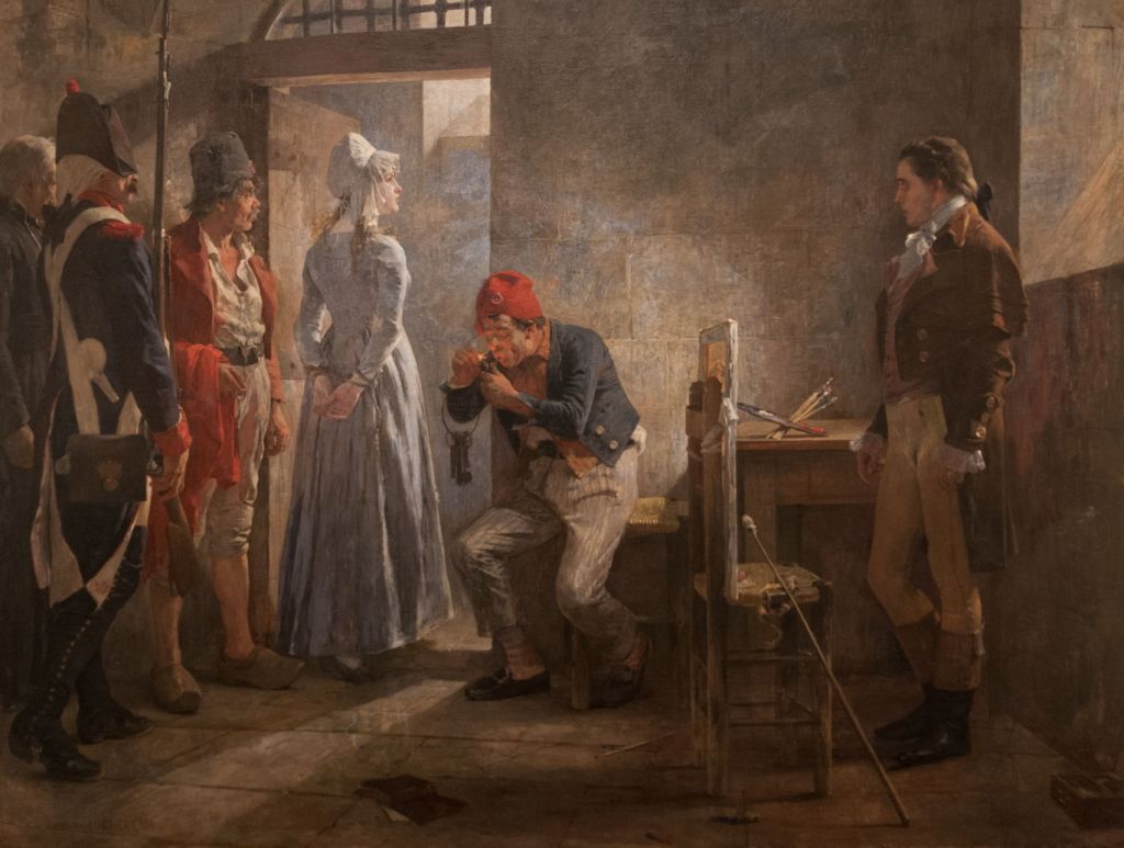 Arturo Michelena’s Charlotte Corday of 1889 is the unknown gem of these portraits. This shows Hauer at the right, his work on her portrait completed just in time for the model’s execution. A jailer is preoccupied in lighting his pipe, and an executioner’s assistant standing behind Corday carries the scarlet overblouse (rather than Duchesne’s red dress) she had to wear to denote her status as traitor.