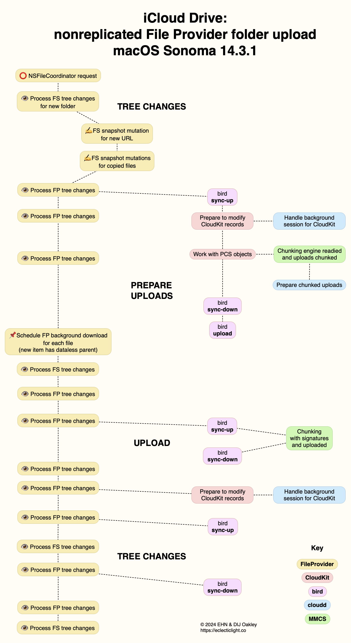 In broad terms, my previous diagram showing stages required to copy up a single folder appeared reasonably accurate, although details of the chunking and chunk upload performed by MMCS aren’t correct. Here’s my updated account as a diagram.
