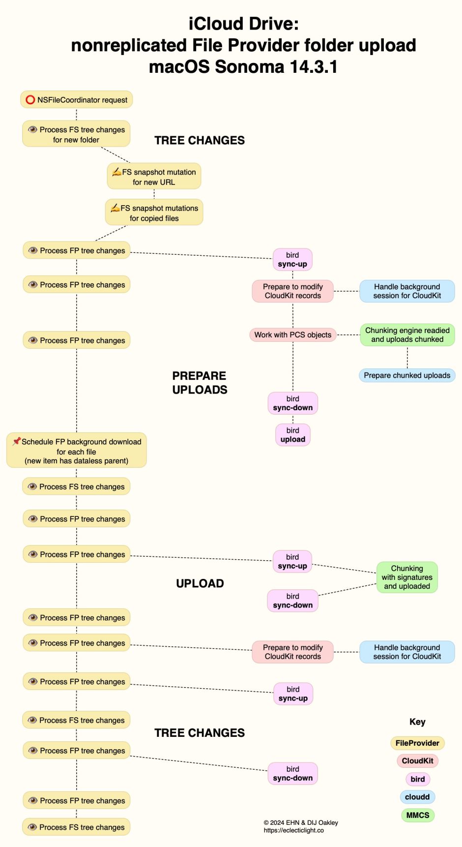bird reports another sync-up, when MMCS adds signatures and keys to the file data chunks, and they’re uploaded to the iCloud server with cloudd activating the connection and CloudKit recording and checking any errors. After that bird calls sync-down for the final phase of tree changes. CloudKit prepares to modify its records, in a background session of cloudd. FileProvider processes a long succession of local and server tree changes, which bird reports are synced up, with a final sync-down.