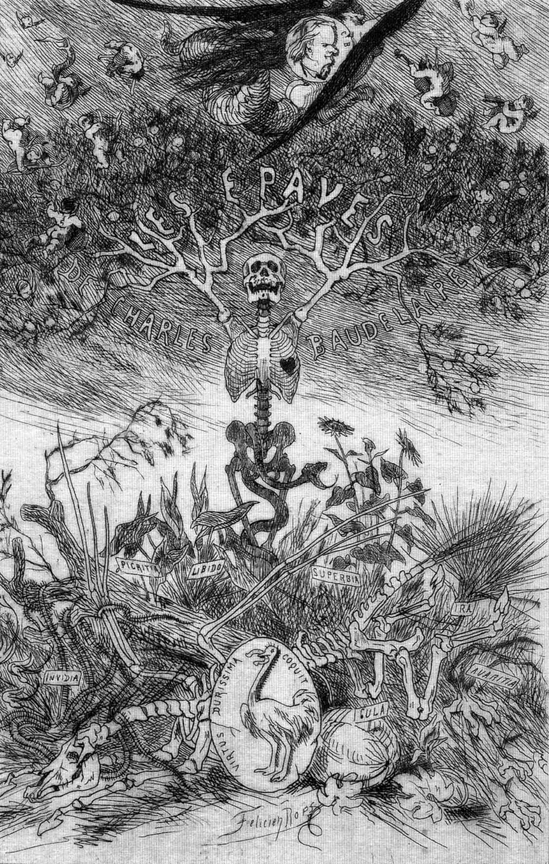 One of the vanguard in their return was the irreverent Félicien Rops, as in his cover illustration for Charles Baudelaire’s Les Épaves (Scraps) from 1866. Here he allies the skeleton of death with the seven deadly sins, named in Latin inscriptions in the lower half of this drawing.