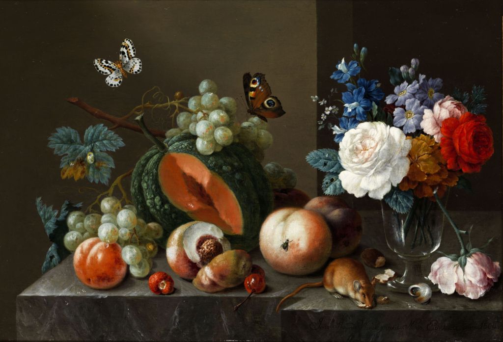 Painted in 1804, Johann Amandus Winck’s magnificent still life of Flowers and Fruits on a Stone Ledge with Butterflies and Mice makes good use of two butterflies, a housefly (perhaps as another vanitas reference), a mouse and a snail.