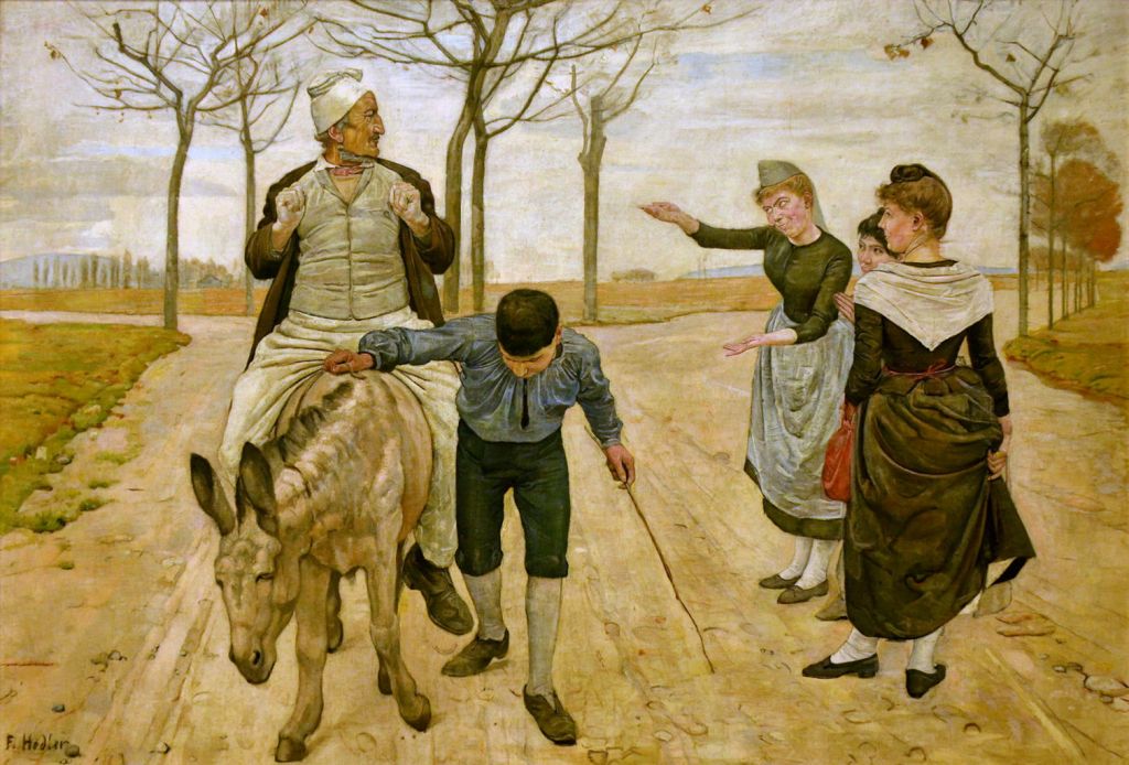Ferdinand Hodler’s The Miller, his Son and the Donkey from about 1888 is a delightful retelling of this classic fable. A miller and his son set out on a journey with their elderly donkey, and were repeatedly corrected by those passing by for their treatment of the donkey, in particular which of the pair should be riding the animal. At this point in the story, it’s the miller who is being borne by the donkey, and his son who’s driving it. Three women passing by are telling the miller what he should be doing, which is apparently quite different.
