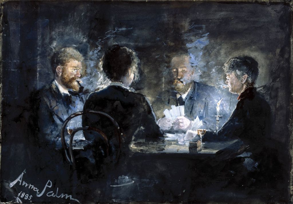Anna Palm de Rosa (1859-1924), A game of L'hombre in Brøndum's Hotel (1885), media not known, 35.6 x 52.4 cm, Skagens Museum, Skagen, Denmark. Wikimedia Commons.