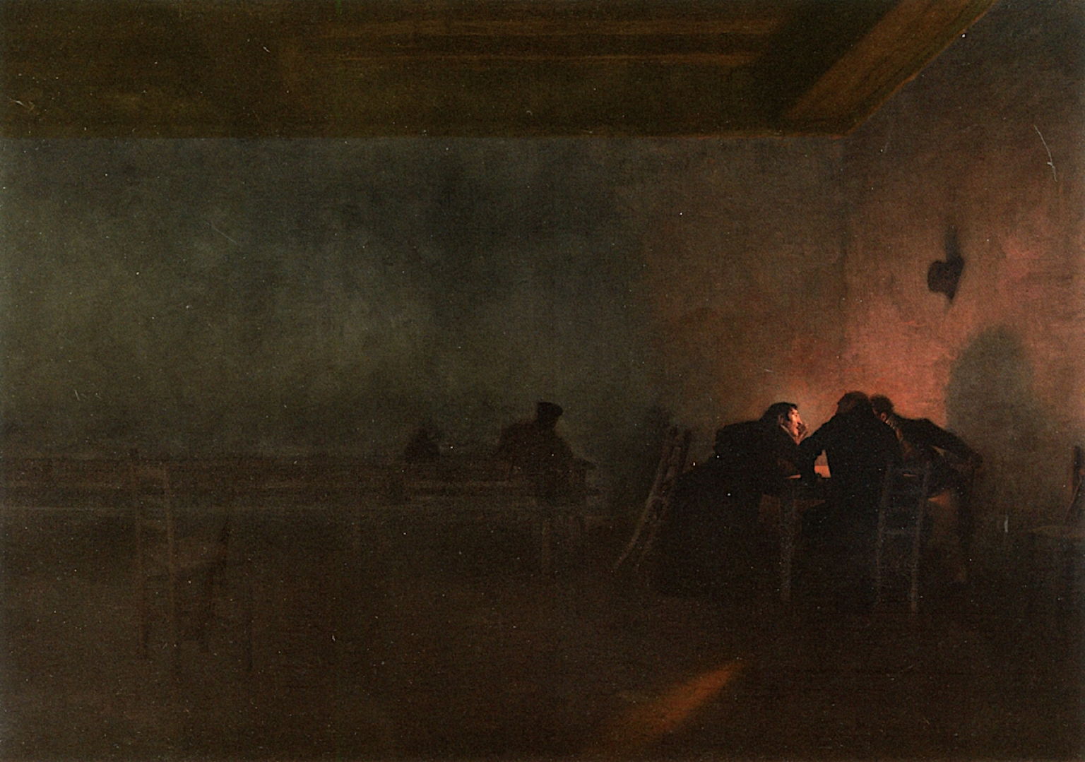 Three men are in a huddle around a table at one end of an otherwise almost empty room. Lit by an unseen lamp between them, they’re discussing something highly secret. One hat hangs high on the wall at the right, and some other clothes are visible on a long bench running along the facing wall. There’s another, empty chair in the middle of the room.