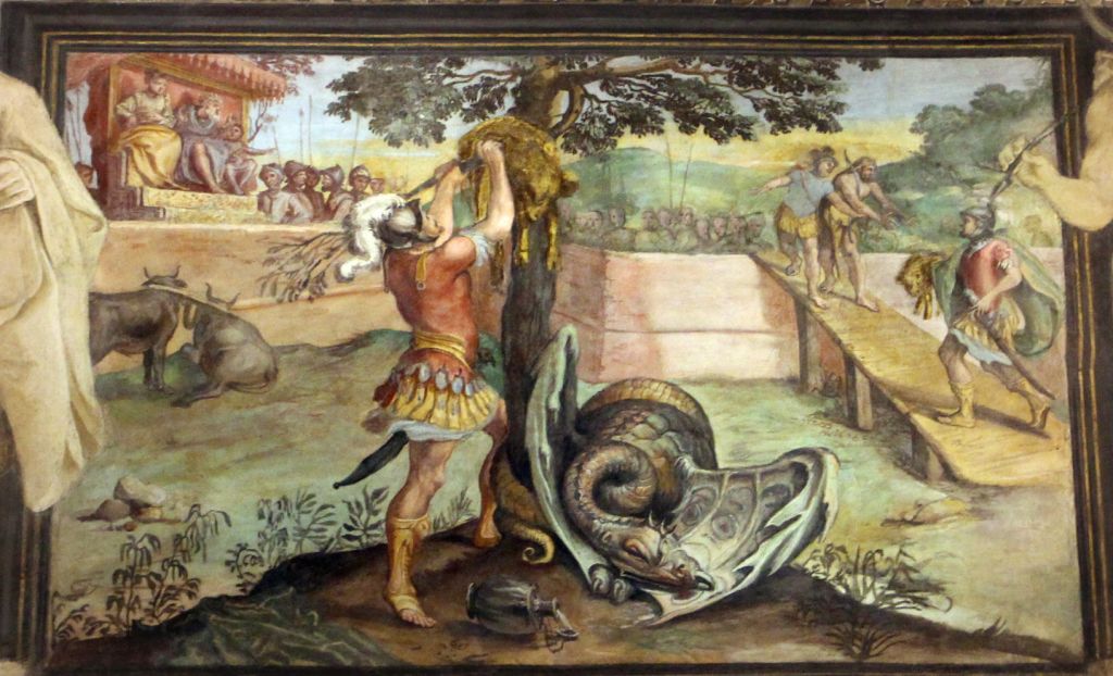 As he is ploughing, Jason sows the teeth of a dragon, required for his second task. As with those sown by Cadmus before he founded the city of Thebes, those teeth instantly grow into an army who point their spears at Jason. Medea tells him to throw a large rock into their midst, to draw their attention so they kill one another instead of Jason.