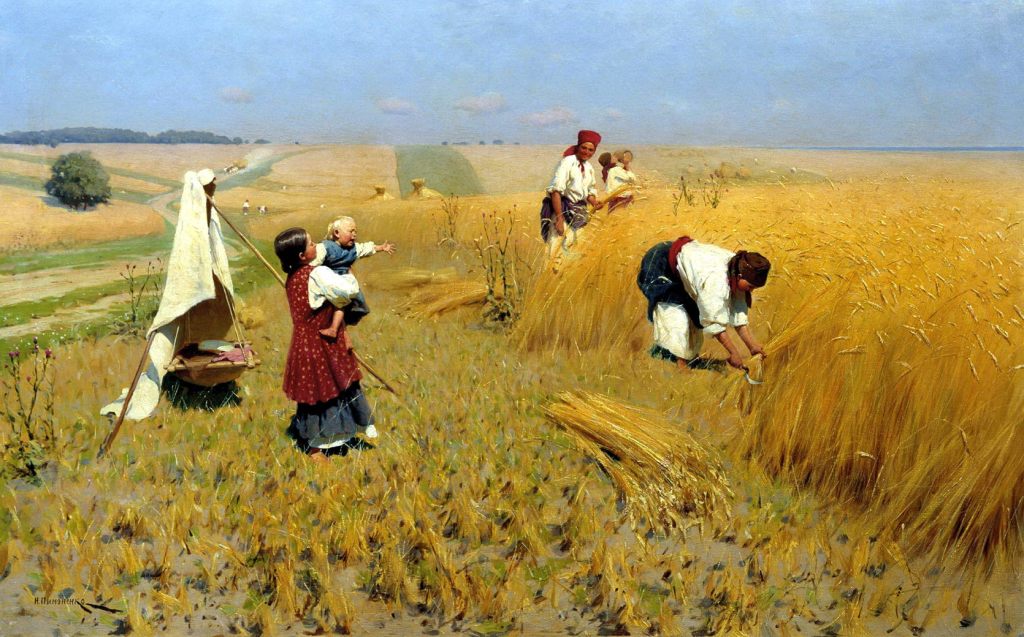 Mykola Pymonenko’s classic view of Harvest in Ukraine from 1896 follows a compositional formula developed by Jules Bastien-Lepage for Naturalist paintings. Its horizon is high, about three-quarters of the way up the canvas. The women in the foreground and the child’s cradle are painted in fine detail, and their edges are so crisp that they pop out. As the figures and fields recede into the background, they rapidly lose detail and their edges blur. The effect is of a vivid reality at the focus of the image, with deep recession to the distant horizon.