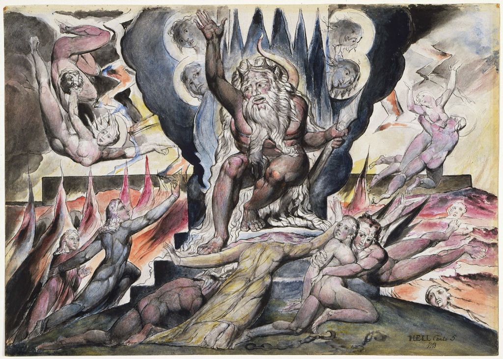 Blake’s watercolour of Minos (1824-27) shows him presiding in judgement over four cavorting couples, in a thoroughly radical vision.