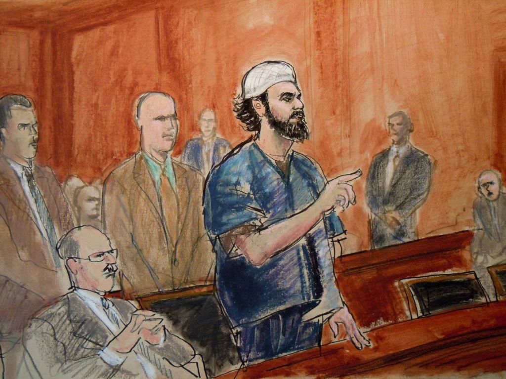 Another fine example of courtroom art is Elizabeth Williams’ portrait of Faisal Shahzad, The “Times Square Bomber” Sentencing, Manhattan Federal Court: October 5, 2010 (2010). Shahzad had pleaded guilty to five counts of federal terrorism-related crimes committed when he planted a car bomb in Times Square, New York, on 5 May 2010, for which he was sentenced to life imprisonment without parole.