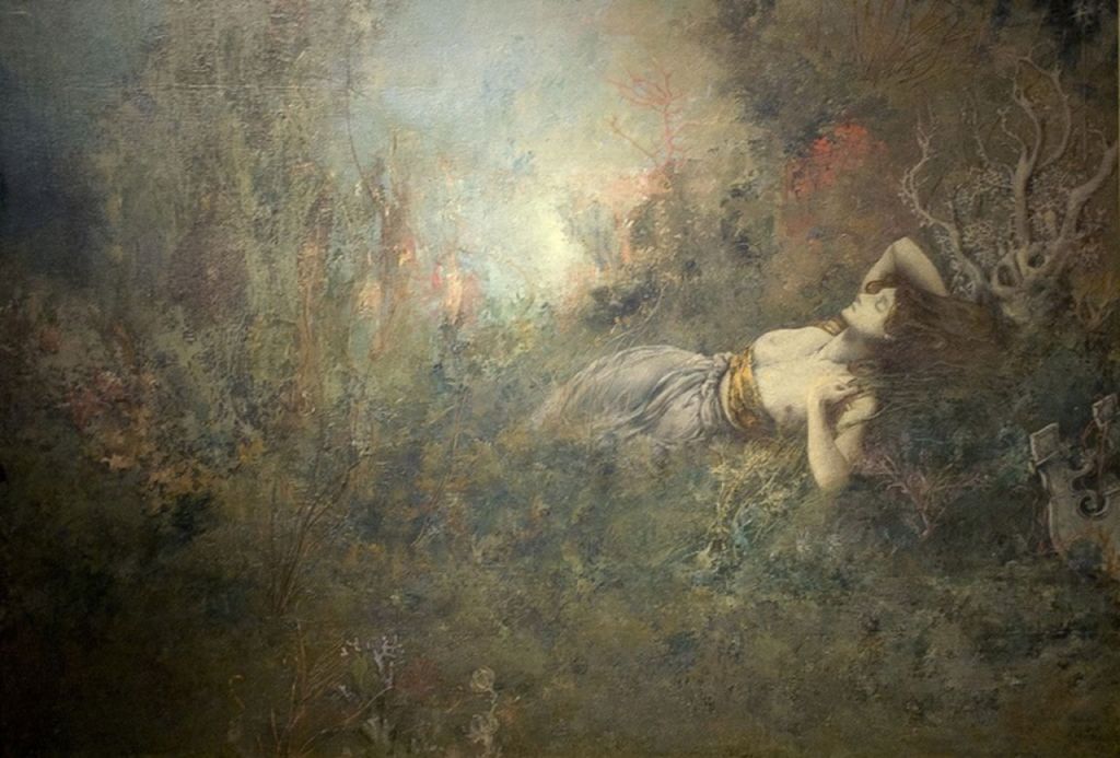 Ary Renan painted Sappho at least twice. The first from 1893 appears influenced by Moreau’s paintings. Sappho reclines underwater amid a fantastic and deep layer of vegetation, her lyre some distance from her head, at the right edge.