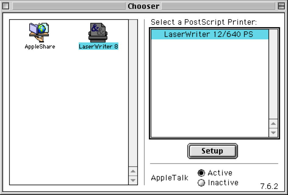 Printer support software was initially primitive, with a small desk accessory named Choose Printer to select which port and driver to use. In System 7 (1991), this became an app in its own right, the Chooser, to handle both printer and network connections.
