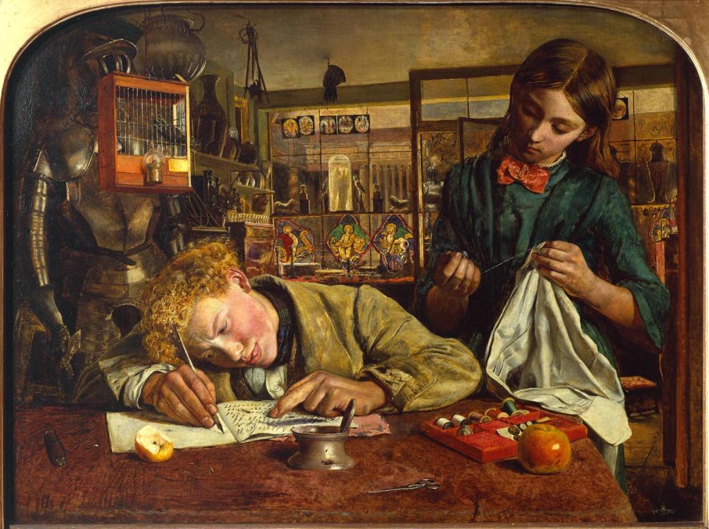The couple have been singing together from Thomas Moore’s Oft in the Stilly Night when she appears to have undergone some revelatory experience, causing her to rise. For Hunt this is associated with a verse from the Old Testament book of Proverbs: “As he that taketh away a garment in cold weather, so is he that singeth songs to an heavy heart.” Ironically, his model was his girlfriend at the time, Annie Miller, an uneducated barmaid who was just sixteen.