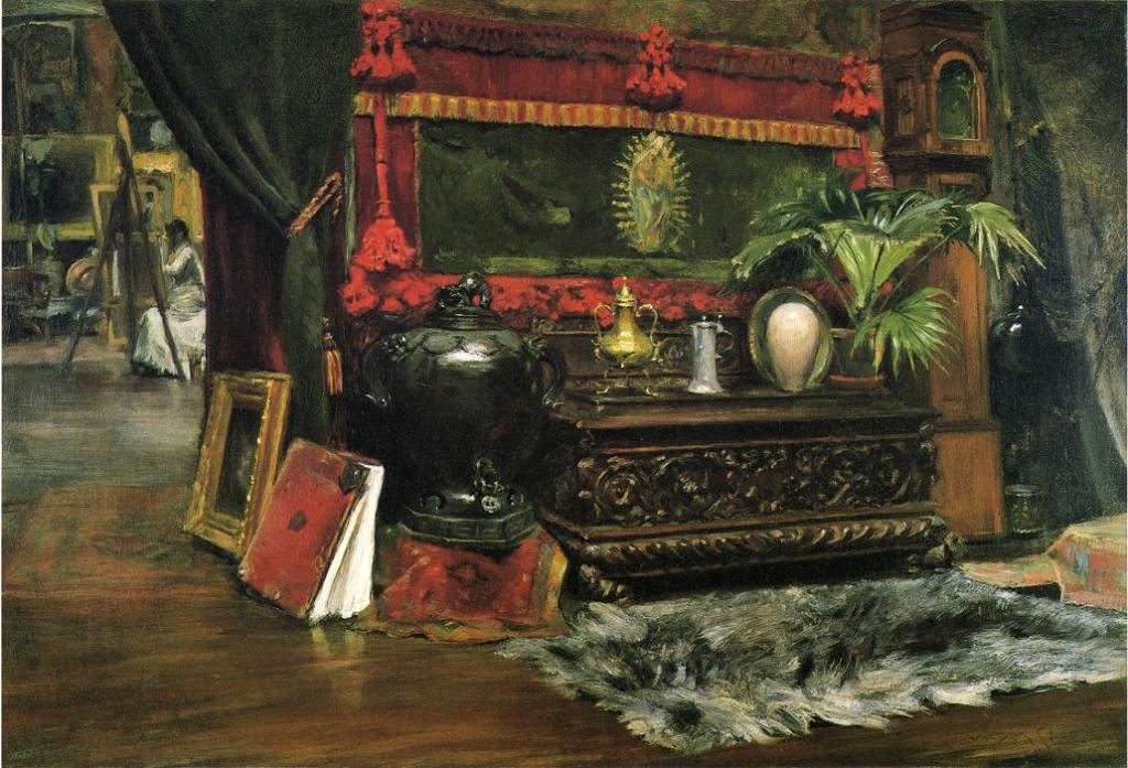 Painted just the year after he moved in, Chase’s Studio Interior (c 1879) is one of his few paintings of studios lacking figures, but shows off his ornately carved wooden chest, a copy of an Old Master, and some of his more exotic props. Chase was quick to recognise the promotional value of his studio: as it grew steadily more exotic, and more populated with his own work, he encouraged the press to write about it, to promote his image as a successful artist.