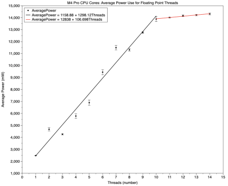 Power use in two in-core performance tests, by number of threads run, leading to estimates of total energy used by P and E cores running the same code, at high frequencies. How efficient are the CPU cores in the M4?