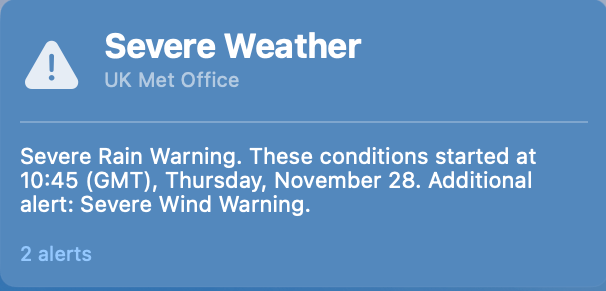 There was no doubt in what we saw: a “significant threat to life or property” that required us to “take action immediately”. As our kitchen features large windows on two sides, we looked out quizzically. Compared to recent days, it was fine, there was no sign of heavy cloud let alone imminent rain, and winds were light. So we went on to look at further details using the link provided. There appeared to be no such warnings in force for any part of the UK.