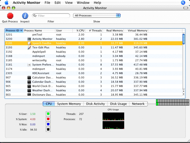 Activity Monitor integrated those features into its new app in Mac OS X 10.3 Panther in 2003, and is shown here in 10.4 Tiger from a couple of years later, where it’s surprisingly similar to the current app. There are still only 72 processes running, though, and most have less than 5 threads.