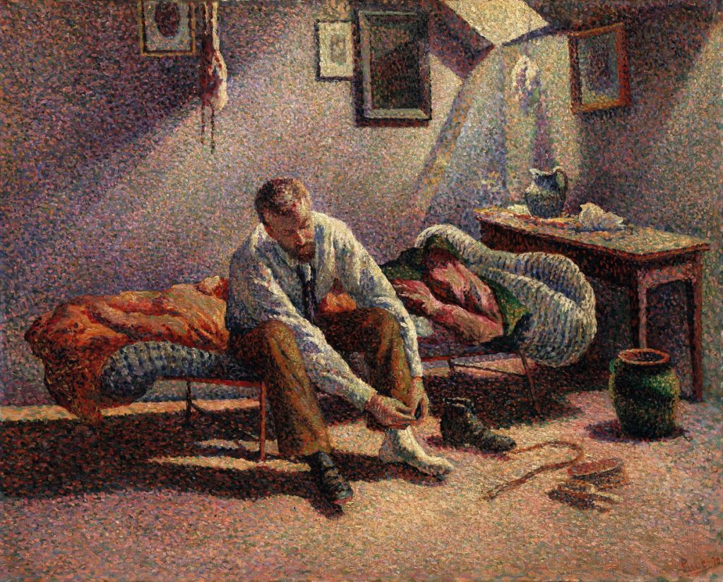 Morning, Interior (1890) is one of Maximilien Luce’s best-known Divisionist paintings from the late nineteenth century. This is a humbler bedroom situated in the uppermost part of the house, a garret perhaps, his dressing table lacks a mirror, and the bed is a lightweight folding model with a thin mattress.