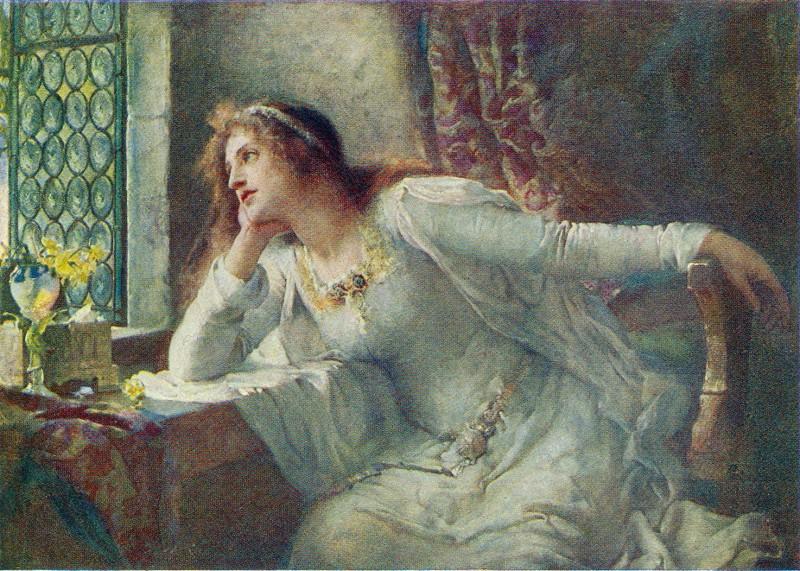 Valentine Cameron Prinsep’s Mariana (c 1888) was intended to serve as an illustration for a printed edition of Shakespeare’s play; this version was printed by Goupil in Paris in 1896. Instead of following Rossetti and Calderon, he uses a similar composition to Stillman. Mariana is here dressed in white, symbolising her purity, and stares out of anachronistic diamond-pane windows, full of yearning.