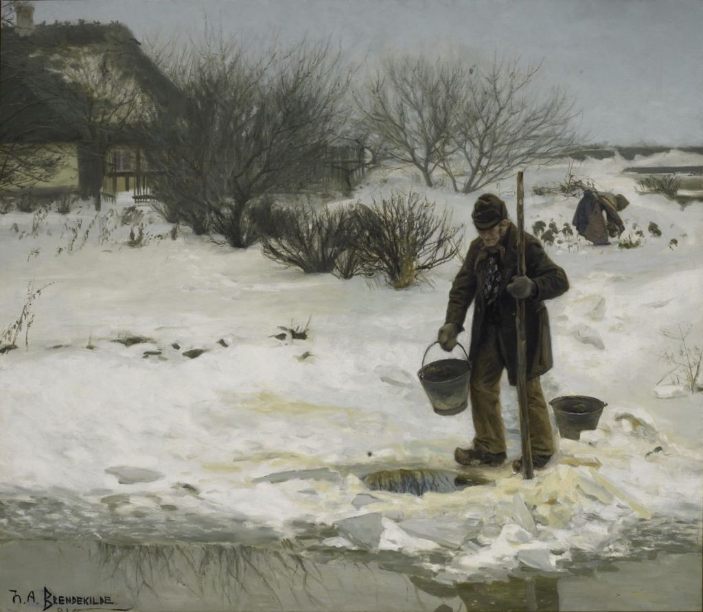 Hans Andersen Brendekilde’s Melting Snow from 1895 is a wonderful depiction of a harsh winter in the country. An elderly couple are doing the outside jobs in typically grey and murky weather, in the backyard of their thatched smallholding. He has walked down to fetch a pail of water from a hole in the ice on the river. Around it the ice is discoloured from contaminants in the water and surely not fit to drink.