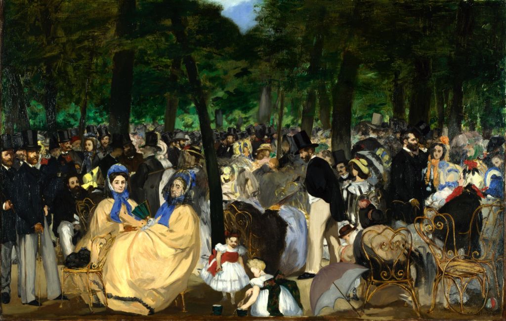 Packed into its rhythmic layout of trees are members of the fashionable Parisian crowd, who have come to listen to the music, socialise, and chat. Historians have identified many of Manet’s circle among them: the poet Baudelaire, novelist Gautier, composer Offenbach, Fantin-Latour the painter, and the artist’s brother Eugène, a painter who married Berthe Morisot, the Impressionist.
