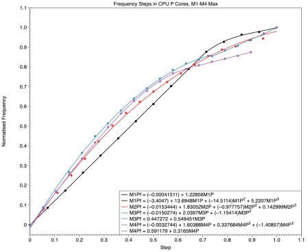 Provides maximum frequencies for E and P cores in each of the M-series, a table of all frequency steps used by current M-series chips, and explanation of how they have come about and their importance.