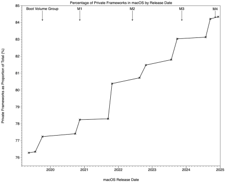 Frameworks provide much of the macOS API. Over the last 5 years, the percentage of Private Frameworks has risen from 76% to 84%. Why is macOS becoming more private?