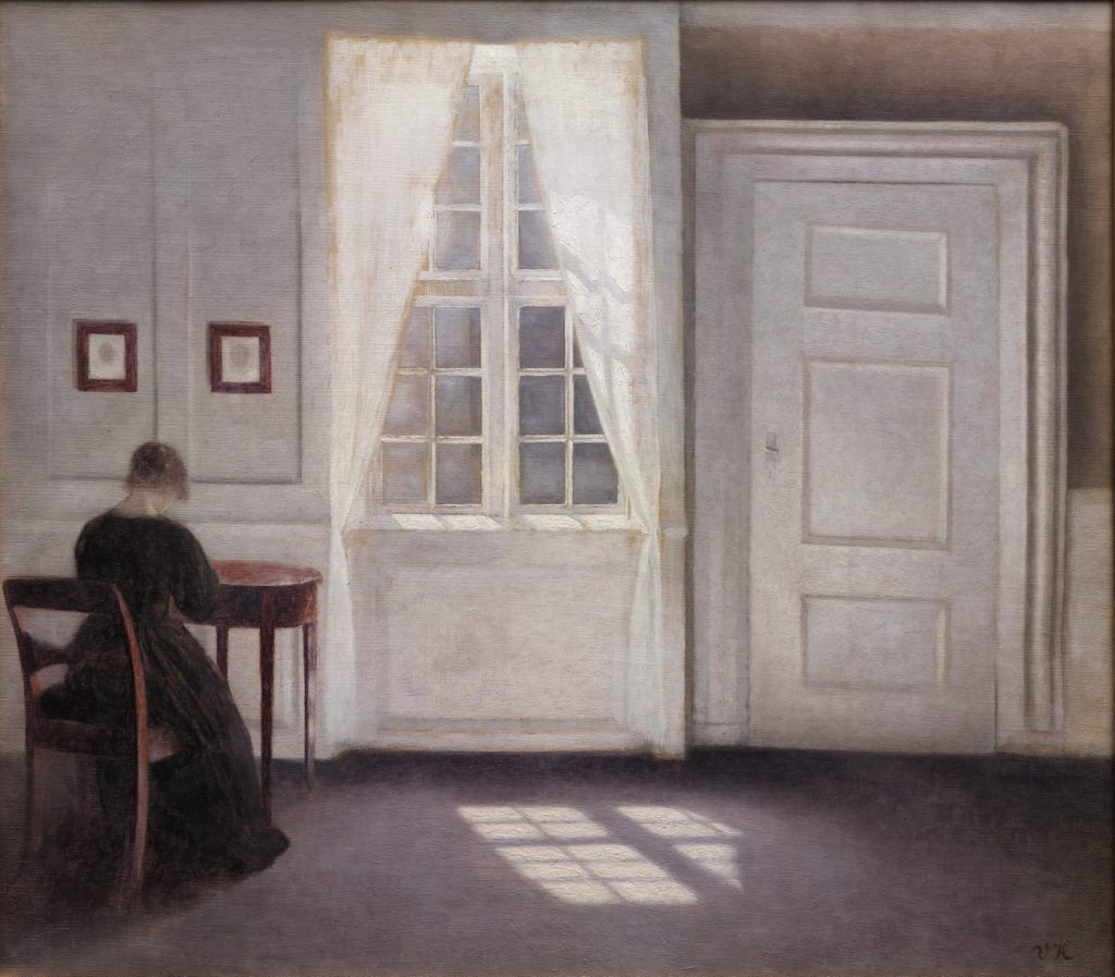 Room in the Artist’s Home in Strandgade, Copenhagen, with the Artist’s Wife from 1901 is one of many in which Hammershøi explores the effects of light pouring in through the apartment’s windows. Two distinctive features of some of his other interiors are noticeable here: irregularity in details that would normally be rectilinear, such as the panels on the door, which look all ‘wonky’; soft focus in parts of the image that might appear similar to that famously used by Vermeer.