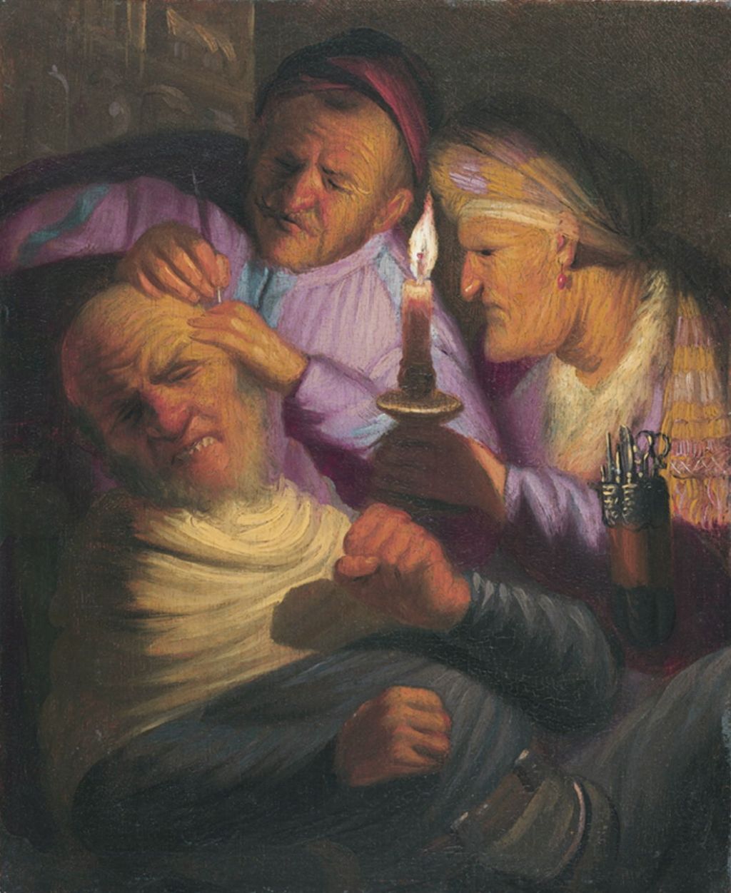 Rembrandt’s early painting of The Operation, from his late teens in 1624-25, shows a barber-surgeon and his assistant performing surgery on the side of a man’s head. This is most likely to have been the lancing of a boil or removal of a tumour from the scalp or pinna of the ear. In the absence of any form of anaesthesia, this visibly resulted in considerable pain for the long-suffering patient, whose eyes and mouth are closed, and his arms are tensed with fists clenched.