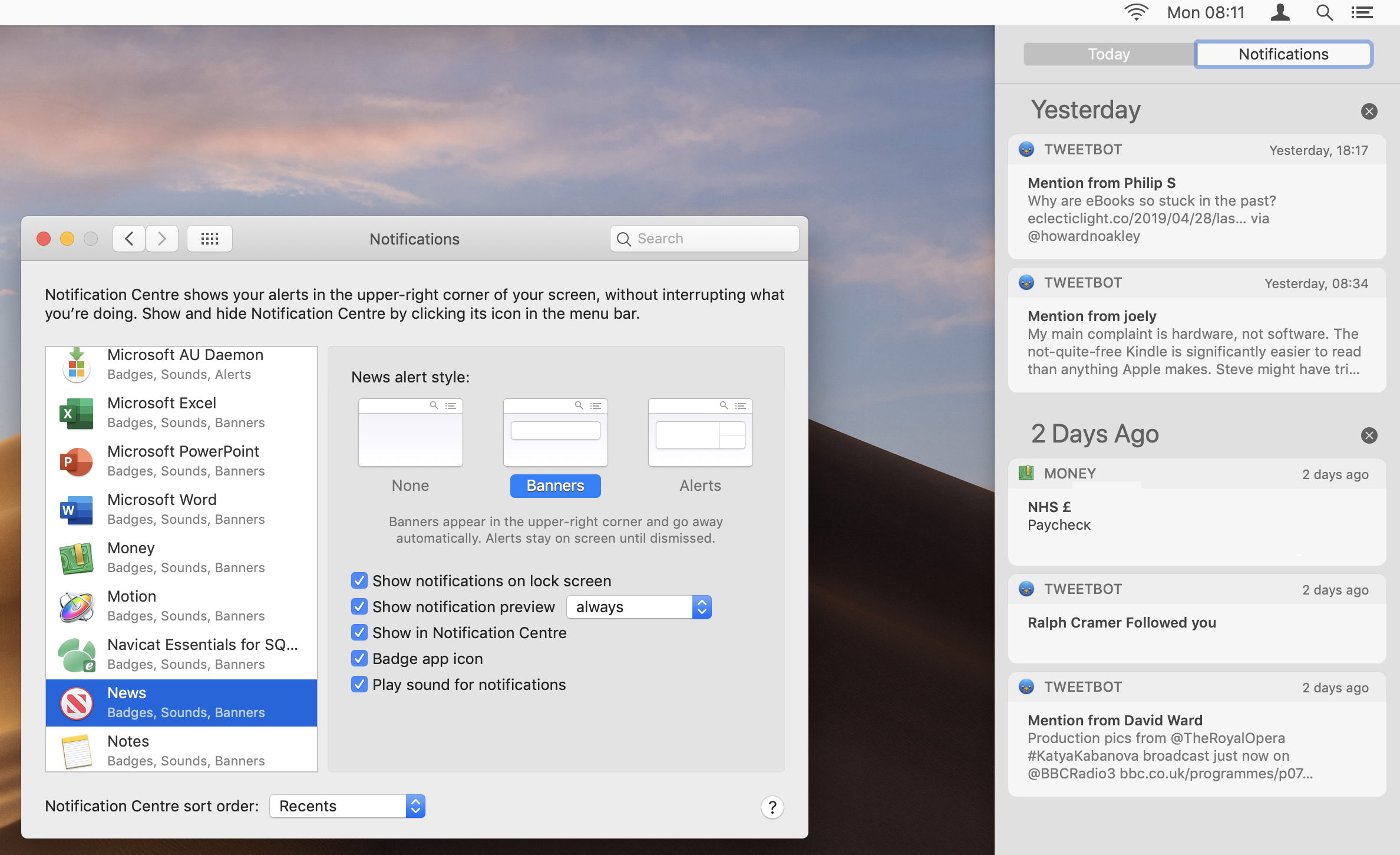 Notifications preferences and their display are seen here in macOS 10.14 Mojave in 2019.