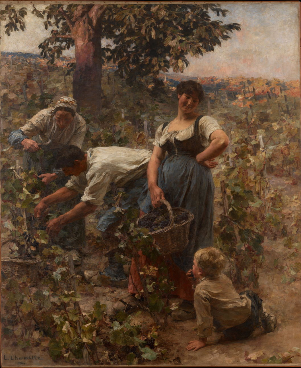 Lhermitte’s countryside wasn’t all bad, though. In The Grape Harvest (1884) there’s the uplifting smile of a mother as she watches her young boy eating the grapes. Behind and to the left, the work of the harvest goes on, and looks back-breaking. The painstakingly realist rendering of the vine leaves here gives this painting a unique visual texture.