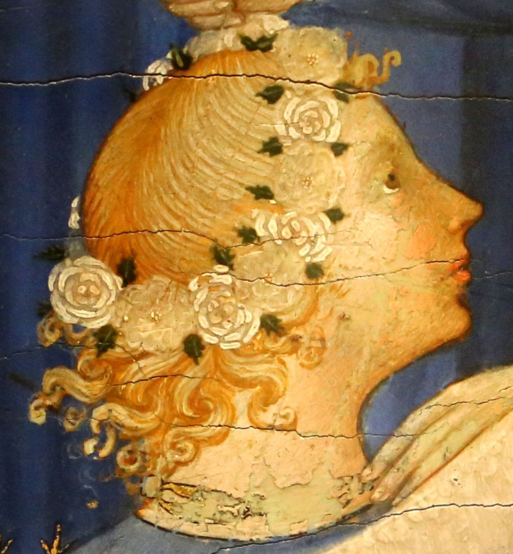 The anonymous Wilton Diptych now in London’s National Gallery is thought to have been painted in egg tempera on a panel in France at the end of the fourteenth century. Its exquisite detail would have been painted in multiple thin layers using fine brushes, much like the miniatures painted on vellum in the previous centuries.