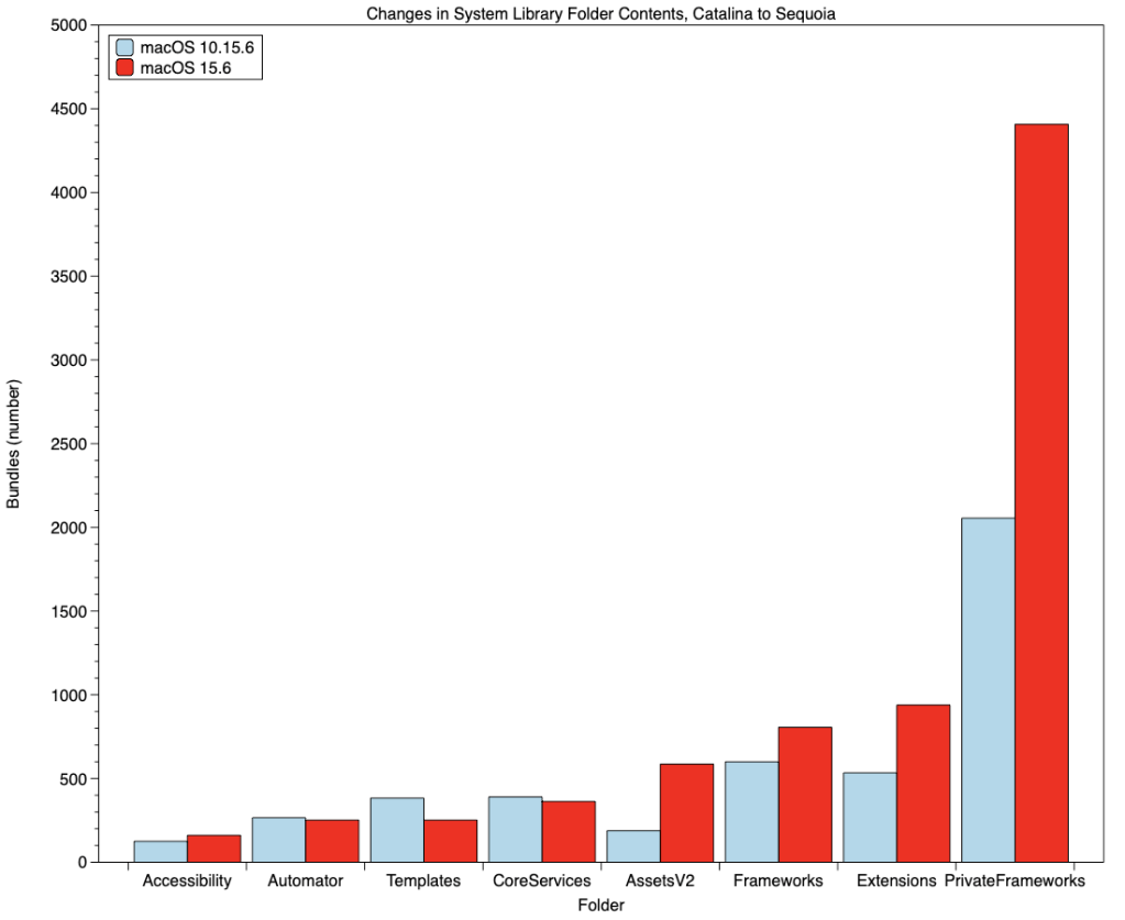 The total number of bundles in /System/Library has risen further to reach 9,304, almost double the number in 10.14.5 six years ago, and up from 8,392 a year ago in 14.6. Unusually, this has risen by nearly 300 through Sequoia’s cycle. Previously it has been more common for only small rises to occur during a cycle, and in macOS 13 the total fell slightly.