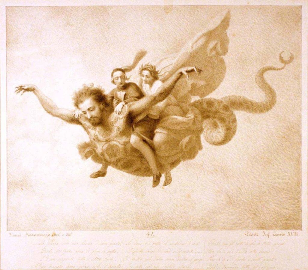 Virgil then jumps onto Geryon’s back, and encourages Dante to have courage to join him there. Once they have both boarded, Virgil tells Geryon to fly off, and the monster carries them down through a hundred spiralling turns to the foot of a high cliff.