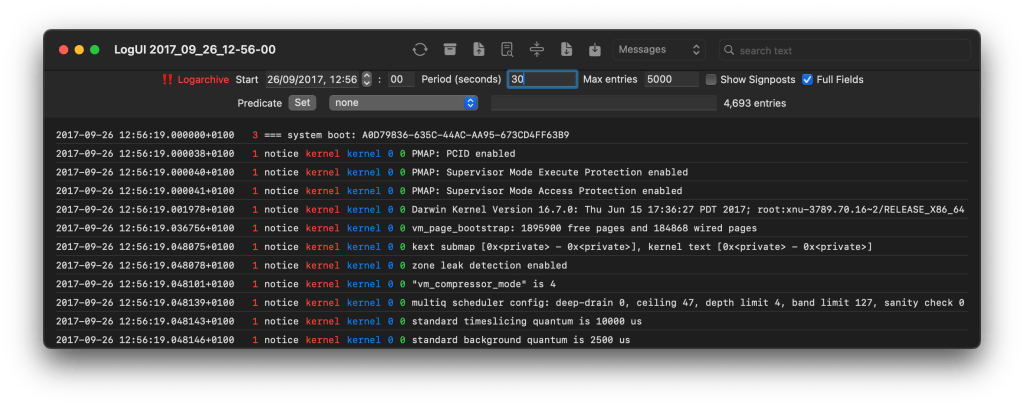 For example, in that tracev3 file containing a total of 42,365,476 entries, the kernel might have written 13,095,296 entries, 30.9%, and be top of the list, while runningboardd might only have written 1,223,157 or 2.9%. These statistics can be valuable in drawing attention to periods when there were problems, and for discovering which entries are limiting the coverage of Persist files, making it impossible for apps to recover entries for XProtect Remediator scans, for example.