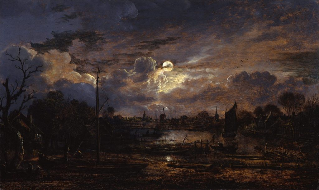 Aert van der Neer (c 1604–1677), River View by Moonlight (c 1650-55), oil on panel, 55 x 103 cm, Rijksmuseum Amsterdam, Amsterdam, The Netherlands. Wikimedia Commons.