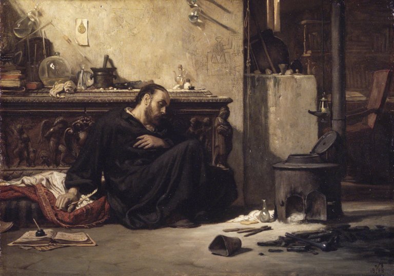 By the late nineteenth century, when Elihu Vedder painted The Dead Alchemist (c 1868), that had changed. Vedder shows a lone figure, slumped and apparently dead against a carved chest. Scattered around him is the equipment that might previously have been used by an alchemist.