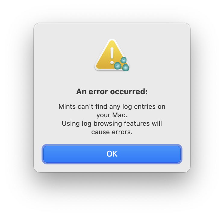 Because these apps are all about inspecting log entries, they incorporate more extensive checks and report errors in more detail. To fetch entries from the log, Mints uses the log show command, while XProCheck and LogUI access them directly through macOS. They all run the following checks when the app is starting up, before its main window is displayed, and will warn you in an alert. When you dismiss that alert, the app will quit to allow you to fix the problem before running it again.