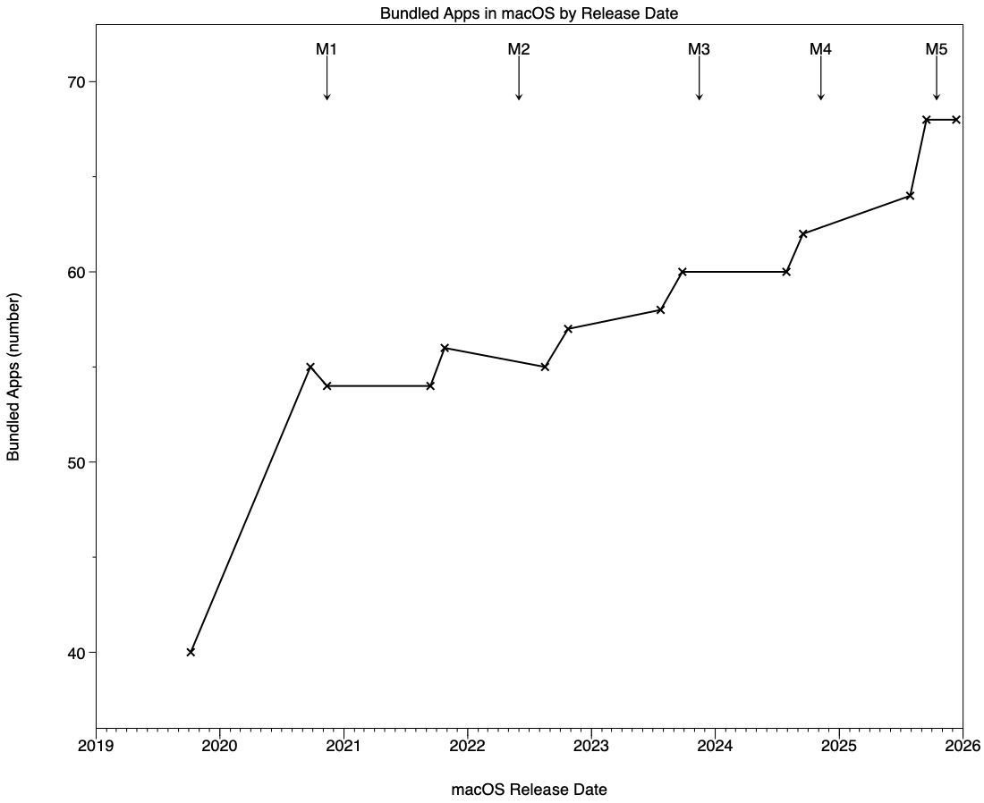 There was a marked rise for Big Sur, since when the total has risen more slowly, from about 55 to 68 today. A few have been removed over that time, such as Network Utility, and others have been relegated to /System/Library/CoreServices/Applications, as has Keychain Access since Sequoia.