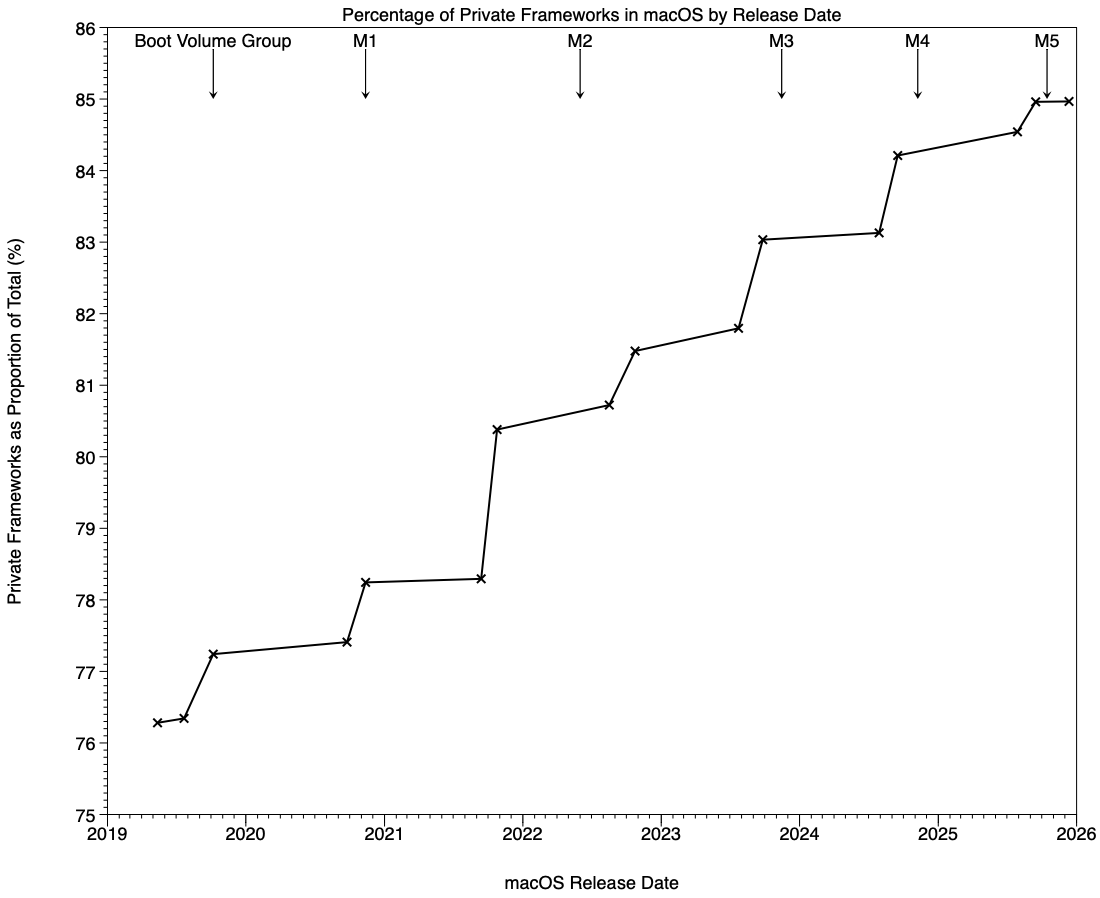 Every new major version of macOS over this period has brought a substantial increase in the percentage of Private Frameworks, rising from 76% in May 2019 to 85% in December 2025. Over that period, macOS has become increasingly private. Although the greatest increases have again largely coincided with the release of new families of M-series chips, the largest rise of all was of 2.1% with the release of macOS 12.0.1, nine months before the release of M2 Macs.